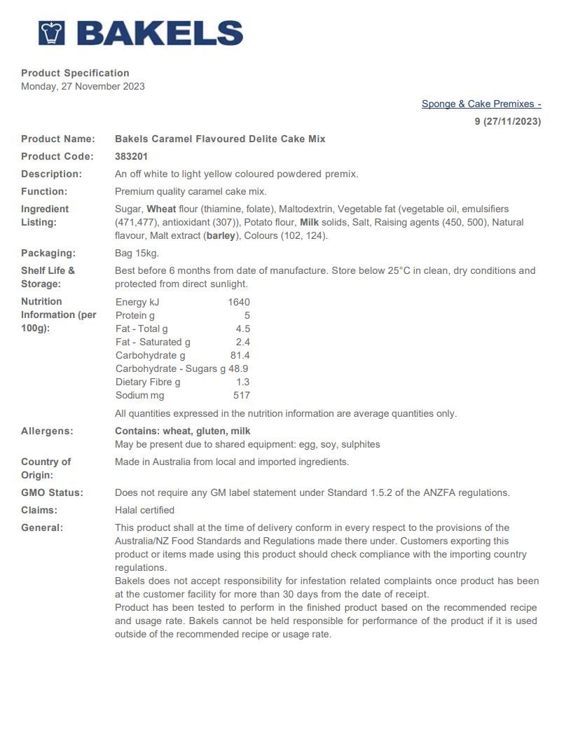 Bakels Caramel Flavoured Delite Cake Mix - 1kg