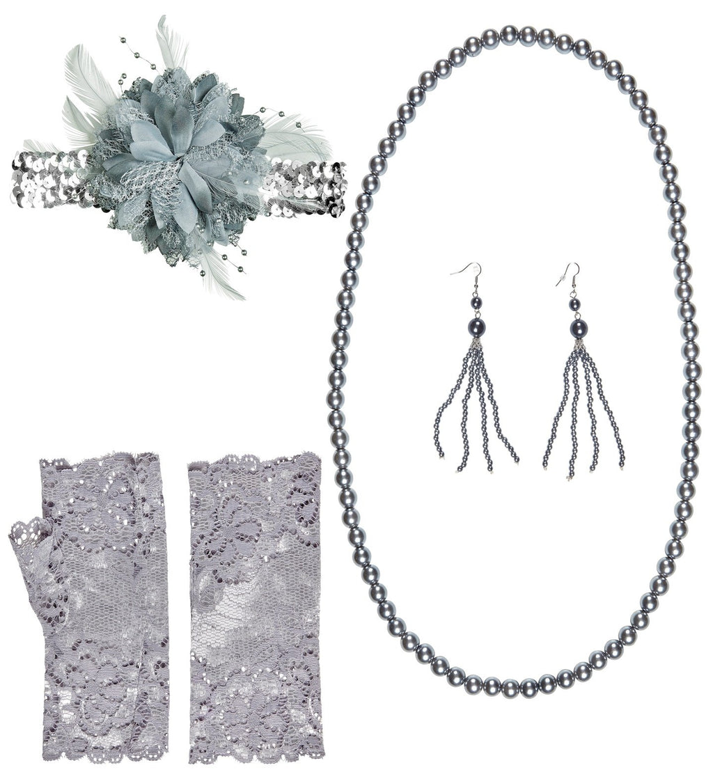 Costume Accessories Roaring 1920s Flapper Silver Set. The dress up set includes a sequin headband with flower, a pair of beaded earrings, a beaded necklace and a pair of fingerless lace gloves.