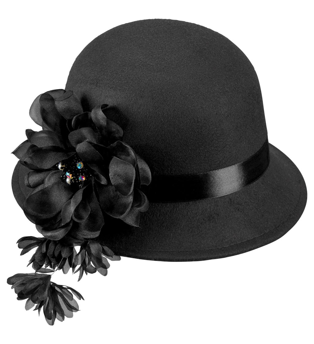 Channel vintage elegance with this stunning black cloche hat, adorned with a dramatic satin flower and sparkling bead accents. Inspired by the iconic 1920s flapper style, this close-fitting hat features a sleek satin band and asymmetrical brim for a timelessly chic look. Perfect for Great Gatsby parties, period costumes, or adding a touch of retro glamour to any outfit.
