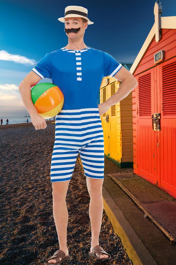 Make a spiffing splash in this 1920s-style bathing costume. Perfect for any roaring 20s themed party, the outfit includes an all-in-one short jumpsuit, straw boater-style hat, and a marvellous moustache! The polyester jumpsuit has a blue, short-sleeved top half with a blue and white striped trim at the neckline and on the chest, creating a buttoned-up effect, and a blue and white striped lower half. The straw boater with a black ribbon trim adds to the stylish beachwear ensemble - because fashion matters, even on the beach - and the fake moustache adds a final flourish, capturing the well-dressed-man look of the era perfectly. (Beachball and sandals not included.)