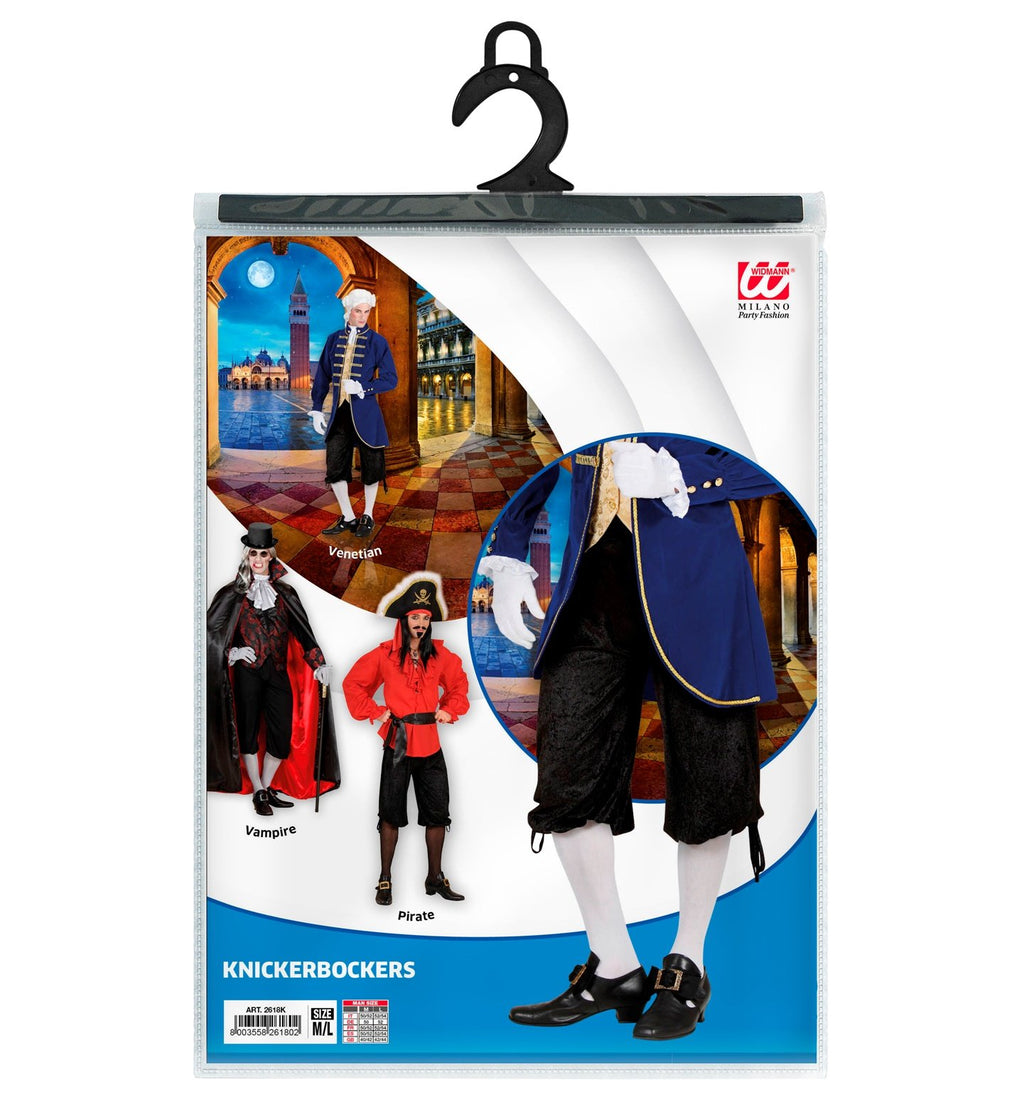 Costume Adult Black Knickerbockers/Pants Victorian English - Gentleman-Pirate-Vampire - Steampunk -Venetian - Middle Ages/Medieval1800's/1900's. These versatile dress up pants for below the knee will suit all the above characters for Book Week or Halloween! Knickerbockers (also known as knickers) were short trousers fastened at the knee or just below, and were widely worn in the 19th and early 20th centuries.