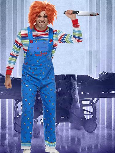 Our brand new adult Mens Chucky costume, is a fantastically realistic costume, and is official Chucky merchandise. Featuring a pair of blue dungarees that are printed and a matching striped top. Be sure to complete the look by adding either a mask or wig from our range of accessories. This costume does not include a knife or a wig.