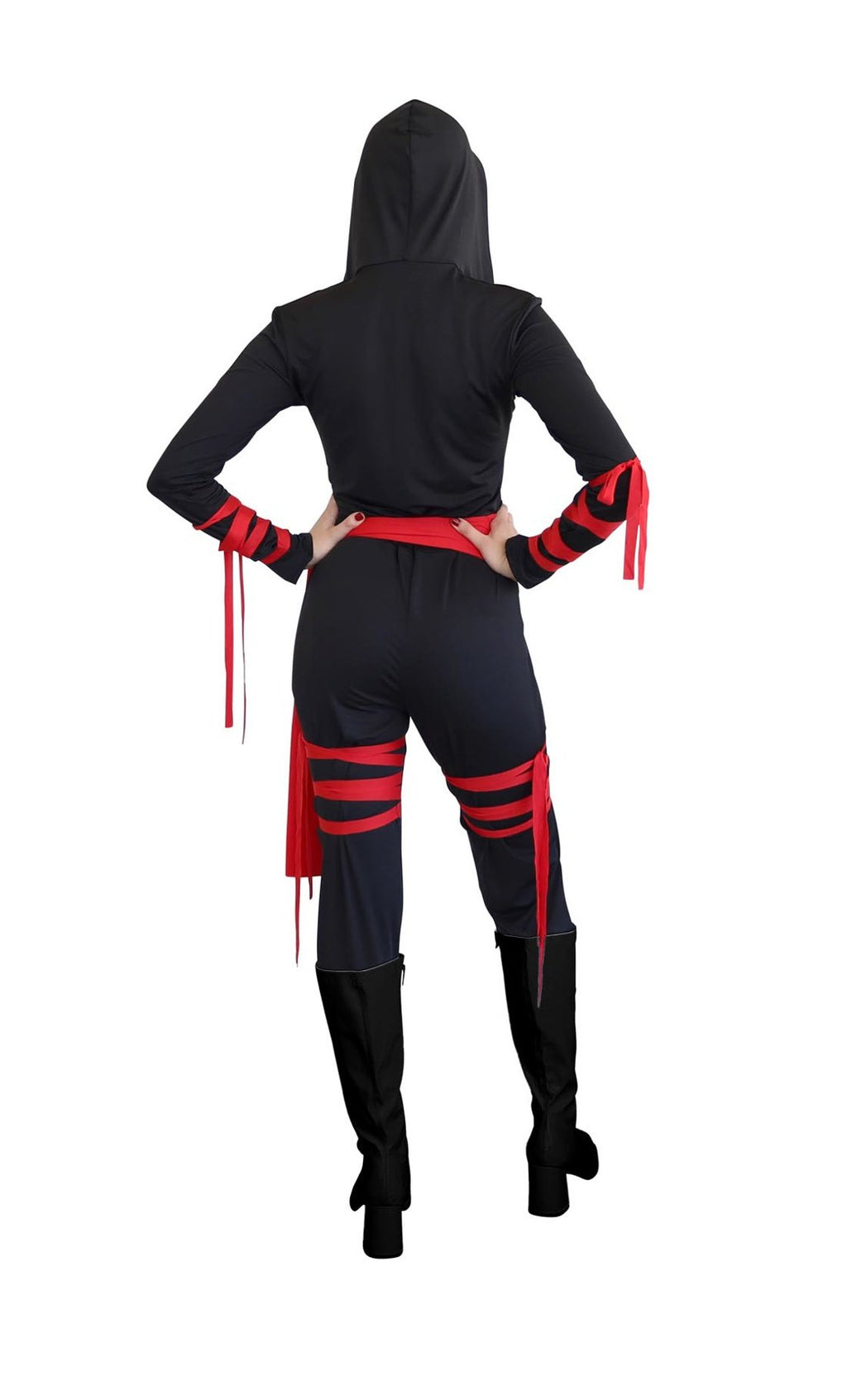 Strike from the shadows and steal the spotlight in our Adult Masked Ninja Girl Costume – the perfect outfit for crashing a party without ever making a sound. With fierce red ties, a sleek black jumpsuit, and a face mask that says “I could disappear at any moment,” this look is equal parts stealth and sass.
