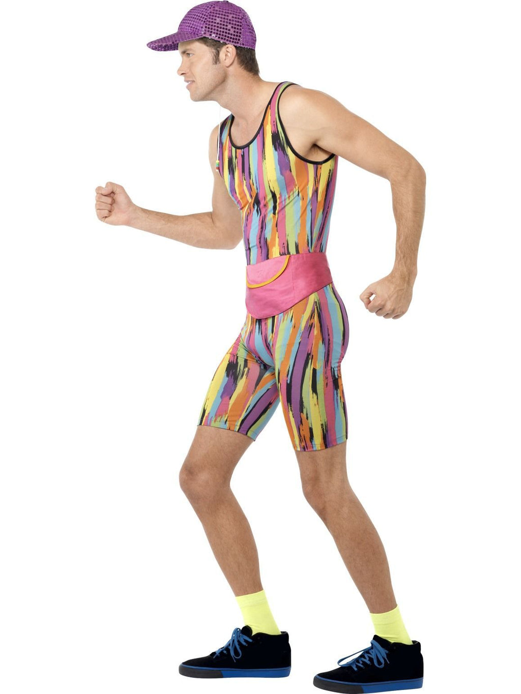 This costume includes the racey multicoloured lycra jumpsuit, hat and bum bag. Take a trip back to the 1980's/1990's!