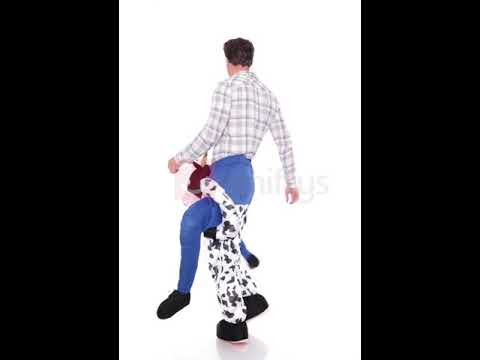 You will get plenty of looks and laughs in our Piggyback Cow Costume with a One Piece Suit with Mock Legs This great costume comes with a One Piece Suit with stuffed Cow and attached hooves shoe covers for your feet. This costume has the cutest Cow face you have ever seen. The padded Mock Legs are attached so it looks as though you're riding on the cows back Please Note:This costume only comes in One size and will fit a waist of 30" - 36" / 76-91 cms