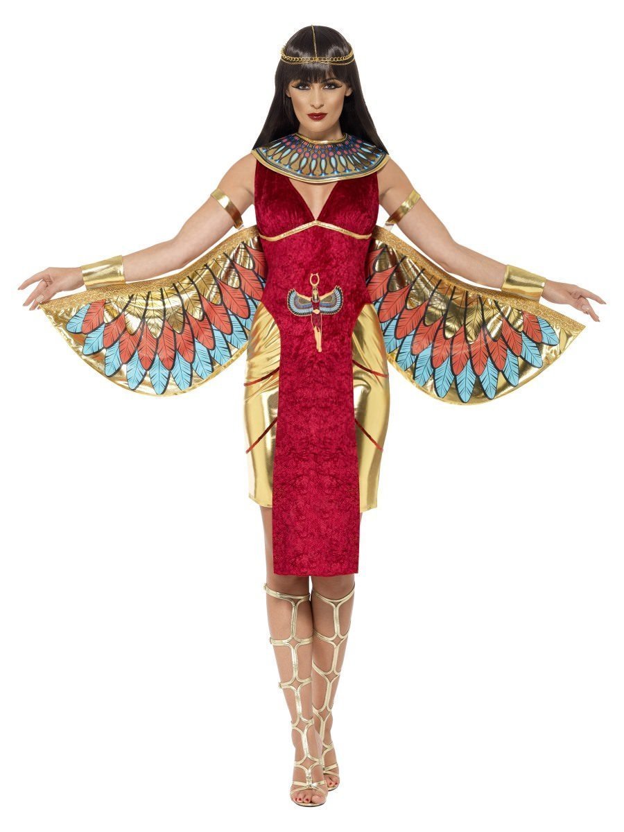 This costume boasts a gorgeous red and gold dress with collar, head piece and wings. A great costume if you want to dress up to create an impression of Cleopatra or Nefertiti - Queen of the Nile.