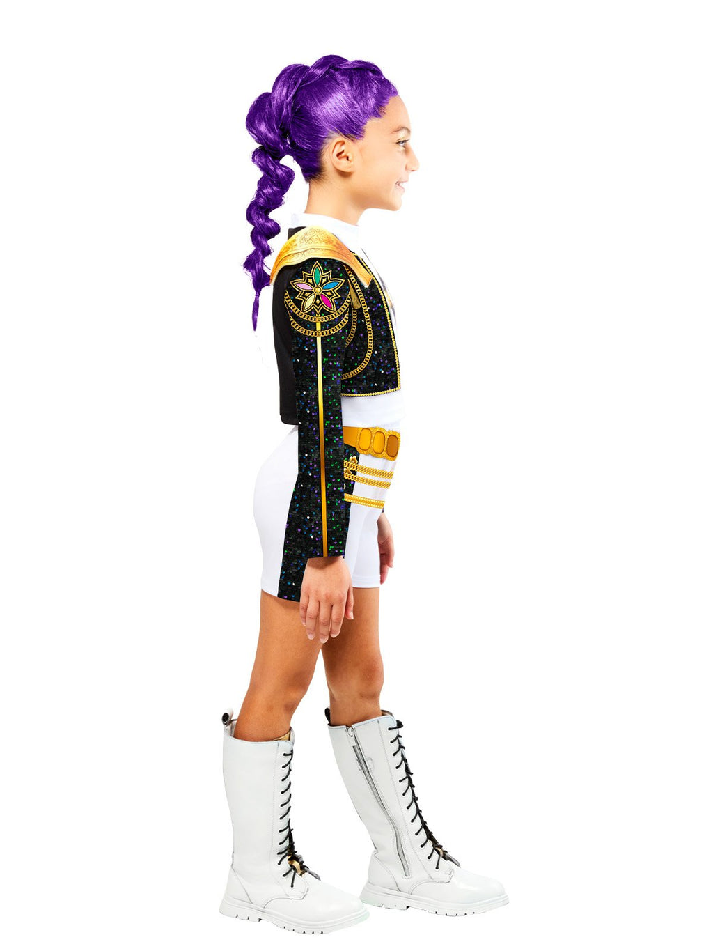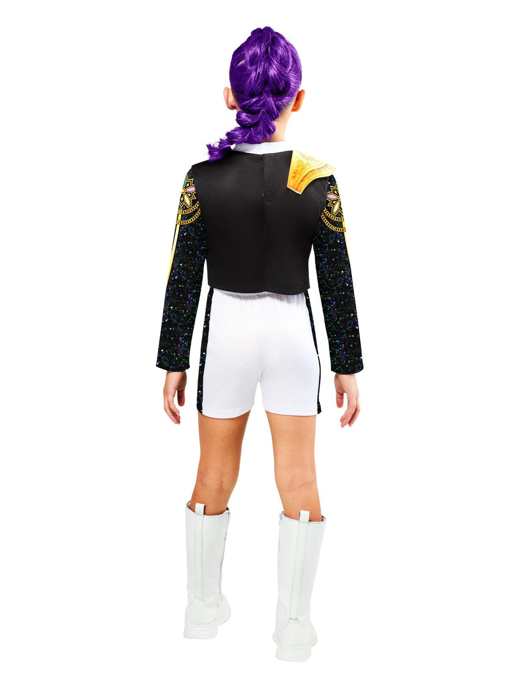 ·Short top has a white high collar and digitally printed details at the chest plus a jacket with shine jersey trim and digitally printed gold trim