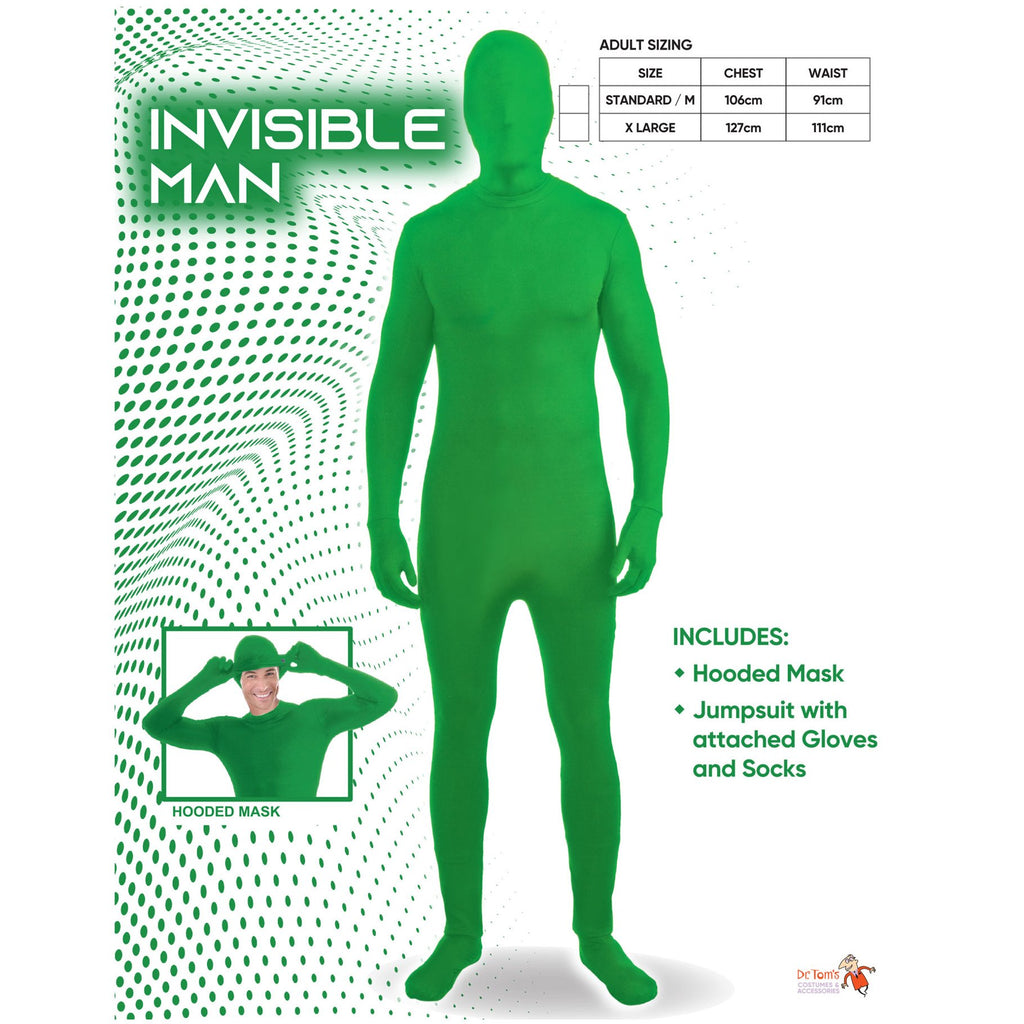 Morph into invisibility with our Spandex stretchy suit! This costume transforms you into a green silhouette and is great for a Halloween costume, bucks party, sports carnivals or the basis for any costume solutions!