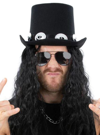 This heavy metal rock'n'roll musician's costume kit includes a tall black top hat with long black curly hair attached and some cool reflective dark glasses. It would be great if you want to dress up to create an impression of Slash - the lead guitarist from Guns N' Roses! Simply add an inflatable guitar, microphone or microphone stand and sing those songs!