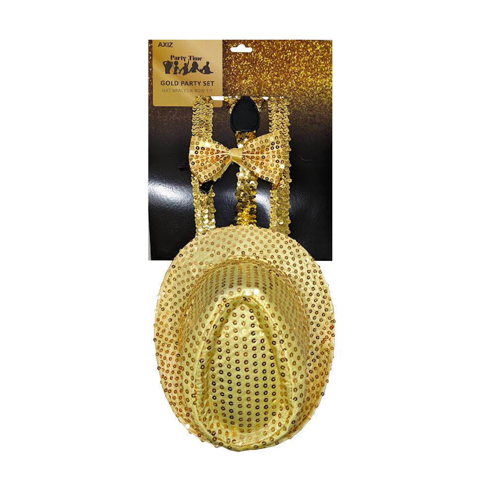 Showtime Gold Sequin Set Fedora Hat Bowtie & Braces 1970s Disco1980s.