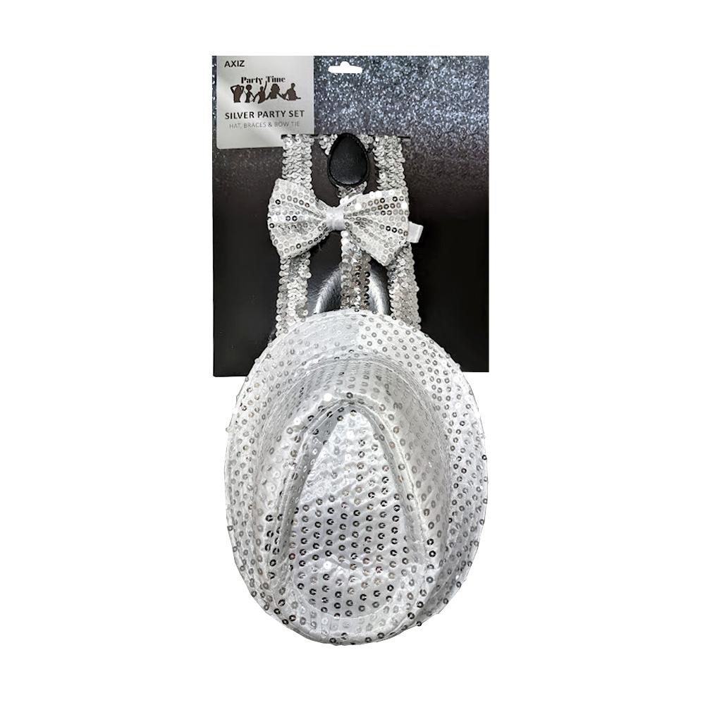 Showtime Silver Sequin Set Fedora Hat Bowtie & Braces 1970s Disco1980s.