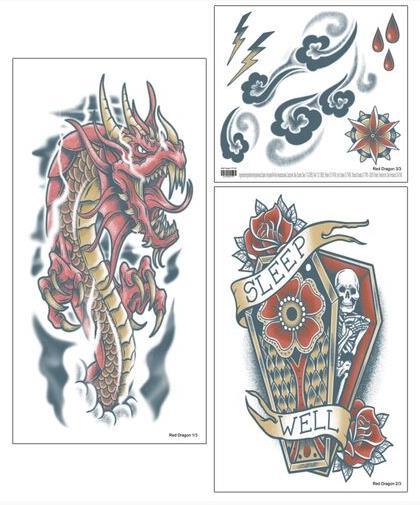 3 Piece, ultra realistic Red Dragon temporary sleeve tattoos. Applies with just water! Created by Academy Award winning makeup artist Christien Tinsley.