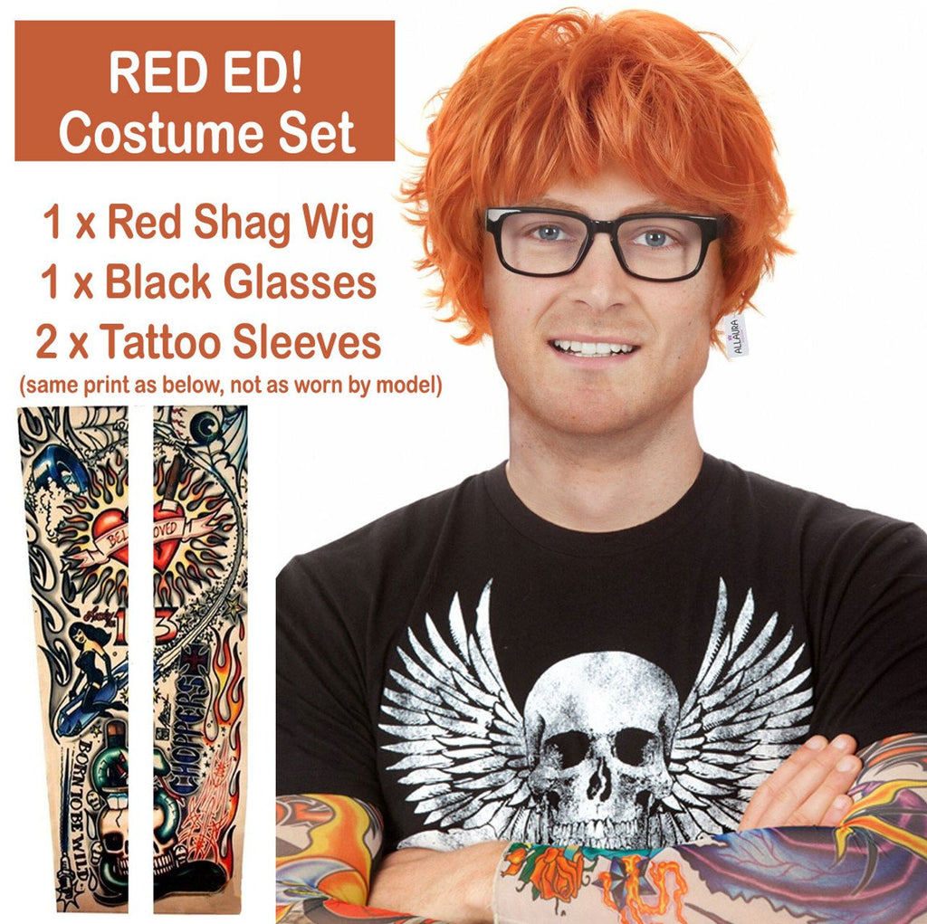 Wig Red Ed Orange/Red With Glasses & Tattoo Sleeve Costume Set.